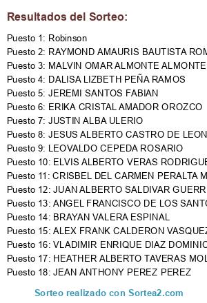 Lista de participantes: JESUS ALBERTO CASTRO DE LEON, ELVIS ALBERTO VERAS RODRIGUEZ, LEOVALDO CEPEDA ROSARIO, HEATHER ALBERTO TAVERAS MOLINA, VLADIMIR ENRIQUE DIAZ DOMINICI, JEREMI SANTOS FABIAN, DALISA LIZBETH PEÑA RAMOS, JEAN ANTHONY PEREZ PEREZ, RAYMOND AMAURIS BAUTISTA ROMERO, BRAYAN VALERA ESPINAL, ERIKA CRISTAL AMADOR OROZCO, Robinson, JUSTIN ALBA ULERIO, ALEX FRANK CALDERON VASQUEZ, MALVIN OMAR ALMONTE ALMONTE, CRISBEL DEL CARMEN PERALTA MENDEZ, JUAN ALBERTO SALDIVAR GUERRERO, ANGEL FRANCISCO DE LOS SANTOS SALAZAR.