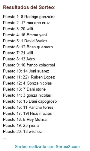 Lista de participantes: 1 David Avalos, 2David avalos, 3 gonza nicolas, 4 Gonza nicolas, 5 Rey Molina, 6 Rey molina, 7 Dani stone, 8 Rodrigo gonzalez, 9 Francisco cerbin, 10 franco colagrosi, 11 Pancho torres, 12 Brian quemero, 13 Adro, 14 Joni suarez, 15 Dani capogroso, 16 Emma yani, 17 mariano cruz, 18 wilchez, 19) Nico macias, 20 willi, 21 willi, 22) Ruben Lopez, 23-jhona, 24) Jhona Kra.