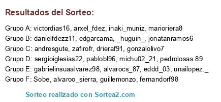 Lista de participantes: unailopez._, andresgute, michu02_21, eddd_03, fernandorf98, drieraf91, gabrielinsuaalvarez98, guillemonzo, gonzalolivo7, zafirofr, Sobe, alvarocs_87, pablobl96, edgarcama, alvaroo_sierra, _huguin_, sergioiglesias22, danielfdezz11, arxel_fdez, victordias16, inaki_muniz, marioriera8, jonatanramos6, pedrolosas.89.