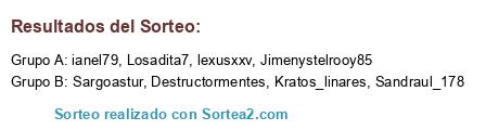 Lista de participantes: Sargoastur, Jimenystelrooy85, Sandraul_178, Destructormentes, Kratos_linares, ianel79, lexusxxv, Losadita7.