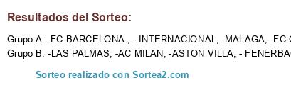Lista de participantes: -FC BARCELONA., -AC MILAN, -MALAGA, -FC OPORTO, - FENERBACHE, -LAS PALMAS, - INTERNACIONAL, -ASTON VILLA.