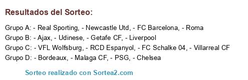 Lista de participantes: - Rayo Vallecano, - FC Bayern, - Malaga CF, - Real Sporting, - Newcastle Utd, - Real Zaragoza, - Spurs, - Ajax, - FC Schalke 04, - Fiorentina, - Getafe CF, - FC Barcelona, - Villarreal CF, - Sporting CP, - Arsenal, - At. Osasuna, - Liverpool, - Chelsea, - Olympique Lyon, - Udinese, - Milan, - Roma, - Inter, - Real Madrid, - PSG, - VFL Wolfsburg, - Manchester City, - UD Las Palmas, - Bordeaux, - RCD Espanyol, - Olympiakos.