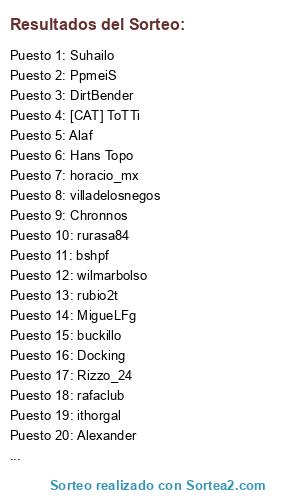 Lista de participantes: Suhailo, ithorgal, Wario_F, Chronnos, villadelosnegos, DirtBender, rafaclub, yamiboy, wilmarbolso, horacio_mx, rubio2t, Cauthon, [CAT] ToTTi, rurasa84, bshpf, Alaf, Kamika-Zero, Chacho, MigueLFg, Docking, PpmeiS, buckillo, Alberkin, Hans Topo, Jamopa, Rizzo_24, Alexander, jona04, Jotasct, Guybrush threepwood.