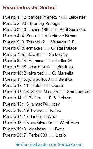 Lista de participantes: 1. Pakitor▶️ R.B. Leipzig, 2. alvarorol▶️ O. Marsella, 3. Trashto12▶️Valencia C.F., 4. Samu▶️ Athletic de Bilbao, 5. iSaiaS▶️ Stoke City, 6. jonvadillo80 ▶️ Benfica, 7. Ferbel333 ▶️ Lazio, 8. ermakea ▶️ Cristal Palace, 9. Vidalsergi ▶️ Betis, 10. Javicm1988 ▶️ Real Sociedad, 11. jnietoh ▶️ Oporto, 12. carlossjimenez7* ▶️ Leicester, 13Halmac76▶️psv, 14. El_noca ▶️ schalke 04, 15. manilmonte▶️ West Ham, 16. Zerhio Miralleh ▶️ Southampton., 17. Lince▶️ Ajax, 18. Joseiguana▶️ Besiktas, 19. Ferxo▶️ Torino., 20. Sporting Portugal.