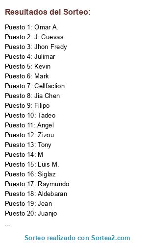 Lista de participantes: Filipo, Siglaz, Angel, Omar A., Nicolas, Julimar, J. Cuevas, Mark, Jean, Ivan E., Luis M., Zizou, Raymundo, Cellfaction, Jhon Fredy, Aldebaran, M, Tony, Jia Chen, Kevin, Tadeo, Juanjo.