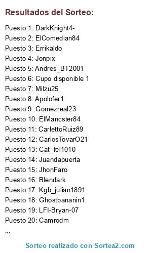 Lista de participantes: JhonFaro, RPBK1810-Gary, CarlosTovarO21, Milzu25, Camrodm, xKingSpider-, Blendark, ElComedian84, ElMancster84, Cat_fel1010, Errikaldo, cllamas5105, Jonpix, Kgb_julian1891, RPBK1810-Jota, Pantrorion, iSanti-4, Apolofer1, Pipefoe10, kakis85, VICTOR-HACHE-89, ziigiik, Jona4283, Halien_villa, DarkKnight4-, jonath1032, Gabigol-_-CA, Gomezreal23, Andres_BT2001, Severoclain1, LFI-Bryan-07, Gasorpasor, Ghostbananin1, juancadiaz07, Shock_DeLaOssa, Juandapuerta, CarlettoRuiz89, Cupo disponible 1, Cupo disponible 2, Cupo disponible 3.