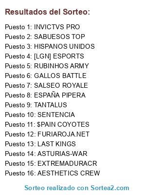 Lista de participantes: [LGN] ESPORTS, $PAIN COYOTES, AESTHETICS CREW, ASTURIAS-WAR, FURIAROJA.NET, INVICTVS PRO, LAST KINGS, SABUESOS TOP, SENTENCIA, TANTALUS, GALLOS BATTLE, SALSEO ROYALE, ESPAÑA PIPERA, EXTREMADURACR, RUBINHOS ARMY, HISPANOS UNIDOS.