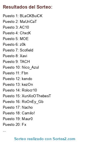 Lista de participantes: Nacho, TACH, Camilo!, mario, XunXoOThebesT, DiegoUC, Daviid, Nico_Azul, Scofield, Rolocr10, Xavi, kezOn, The_PokeFlay, Fx, Maur0, z0k, Fbn, Zr7, dreyko, Titoi, sebas, Ibra213, DOSP, topo, kendo, Zega, Parm3, skyline, KatooH, MaUriCaT, MOE, ChxcK, Xpektro, Darkoxz, BLaCKBuiCK, Adrian, *UC*Arthas, ecosent1do, AC10, RoOnEy_Gb.
