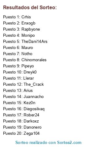 Lista de participantes: diegoignacio, matias8, donelemento, darkoxz, castro7, franconicolasb, Llerar, mauro, Rap, Lithox, Zega, DiegoSilva, Px, Craack, Jarellano, monipo, NickoUc, Ro92, El_Illuminati, QuickSilver.