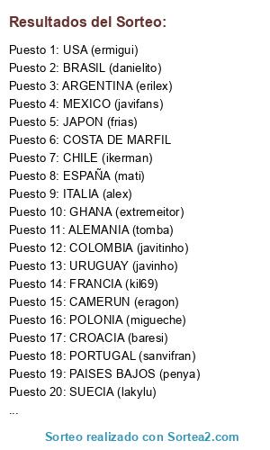 Lista de participantes: BELGICA (jordi), INGLATERRA (flekis), FRANCIA (kil69), ALEMANIA (tomba), ITALIA (alex), PAISES BAJOS (penya), PORTUGAL (sanvifran), ESPAÑA (mati), COSTA DE MARFIL, ARGENTINA (erilex), BRASIL (danielito), COLOMBIA (javitinho), URUGUAY (javinho), POLONIA (migueche), CROACIA (baresi), GHANA (extremeitor), CAMERUN (eragon), MEXICO (javifans), USA (ermigui), CHILE (ikerman), JAPON (frias), SUECIA (lakylu).