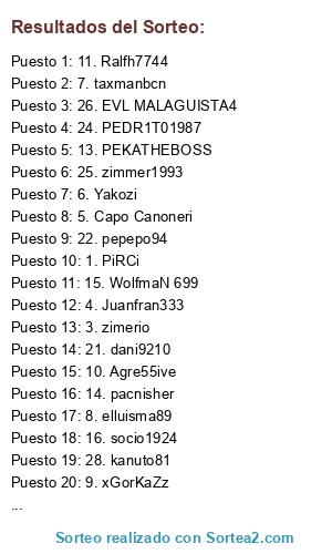 Lista de participantes: ALEMANIA: 26. jose4909, ARGENTINA: 10. cristian567, AUSTRIA: 8. Terrapias, BELGICA: 6. Ayomah, BRASIL: 18. SPL-Sezar9, CAMERUN: 32. JesusElx, CHILE: 24. Setibi, COLOMBIA: 9. JMaraver, COREA DEL SUR: 16. TheNaranjo95, COSTA DE MARFIL: 20. enoizehardcor, ECUADOR: 15. Miki_isotopos, ESCOCIA: 2. Jeibleiss, ESPAÑA: 28. MoRTaLChRiiiiS, EEUU: 25. vimavillo, FRANCIA: 17. iM3c, GRECIA: 14. Wallygar, HOLANDA: 4. KniBC, INGLATERRA: 30. KutyyYYyyYY, ITALIA: 12. koblas73, MEXICO: 19. vieri93, PARAGUAY: 7. barci19, PERU: 22. VillaMLG7, POLONIA: 11. MrIstoy, PORTUGAL: 21. Yunqera, REP. IRLANDA: 27. jfdeza, REP. CHECA: 3. civerika92, RUMANIA: 5. DanyGuaje89, RUSIA: 29. pons55, SUECIA: 23. Escorpion117, SUIZA: 31. VirutAR, TURQUIA: 1. Alguba90, URUGUAY: 13. iagoming.