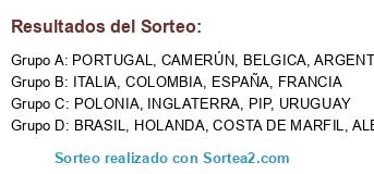 Lista de participantes: ESPAÑA, BRASIL, INGLATERRA, FRANCIA, ALEMANIA, ARGENTINA, ITALIA, PORTUGAL, BELGICA, HOLANDA, URUGUAY, COLOMBIA, POLONIA, COSTA DE MARFIL, CAMERÚN, PIP.