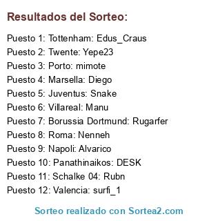 Lista de participantes: Valencia: surfi_1, Napoli: Alvarico, Villareal: Manu, Borussia Dortmund: Rugarfer, Marsella: Diego, Schalke 04: Rubn, Porto: mimote, Twente: Yepe23, Panathinaikos: DESK, Roma: Nenneh, Juventus: Snake, Tottenham: Edus_Craus.