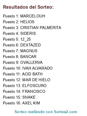 Lista de participantes: SIDERIS, ACID BATH, MAR DE HIELO, AXEL KIM, CRISTIAN PALMERITA, HELIOS, ELFOSCURO, MAGNUS, BANCAR, OVALLERVA, DEXTAZED, 12_25, FRANCISCO, MARCELOUH, SNAKE, IVAN ALVARADO.