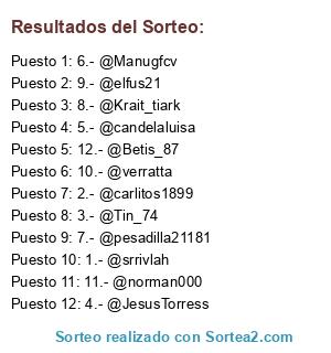 Lista de participantes: 1.- @srrivlah, 2.- @carlitos1899, 3.- @Tin_74, 4.- @JesusTorress, 5.- @candelaluisa, 6.- @Manugfcv, 7.- @pesadilla21181, 8.- @Krait_tiark, 9.- @elfus21, 10.- @verratta, 11.- @norman000, 12.- @Betis_87.