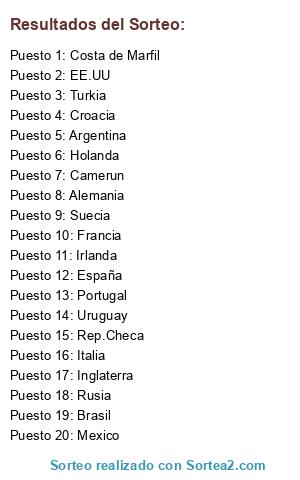Lista de participantes: España, Brasil, Francia, Inglaterra, Argentina, Italia, Holanda, Portugal, Alemania, Camerun, Costa de Marfil, Uruguay, Mexico, EE.UU, Turkia, Suecia, Rep.Checa, Rusia, Croacia, Irlanda.