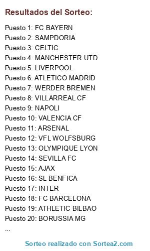 Lista de participantes: AJAX, ATHLETIC BILBAO, BOR. DORTMUND, BORDEAUX, CELTIC, EVERTON, FC BAYERN, MANCHESTER CITY, MANCHESTER UTD, NAPOLI, OLYMPIAKOS, OLYMPIQUE LYON, REAL BETIS, SEVILLA FC, VALENCIA CF, VFL WOLFSBURG, AC MILAN, ARSENAL, ATLETICO MADRID, BORUSSIA MG, CHELSEA, FC BARCELONA, INTER, LIVERPOOL, PSG, REAL MADRID CF, REAL SOCIEDAD, SAMPDORIA, SL BENFICA, UD LAS PALMAS, VILLARREAL CF, WERDER BREMEN.