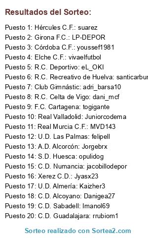 Lista de participantes: Hércules C.F.: suarez, C.D. Sabadell: Imanol69, U.D. Almería: Kaizher3, Córdoba C.F.: youssef1981, Real Valladolid: Juniorcodema, R.C. Deportivo: eL_OKI, A.D. Alcorcón: Jorgebrx, U.D. Las Palmas: felipell, C.D. Guadalajara: rrubiom1, Xerez C.D.: Jyasx23, R.C. Celta de Vigo: dani_mcf, Elche C.F.: vivaelfutbol, C.D. Alcoyano: Danigea27, Real Murcia C.F.: MVD143, R.C. Recreativo de Huelva: santicarburos, Girona F.C.: LP-DEPOR, C.D. Numancia: jacobillodepor, S.D. Huesca: opulidog, Club Gimnástic: adri_barsa10, F.C. Cartagena: togigante.