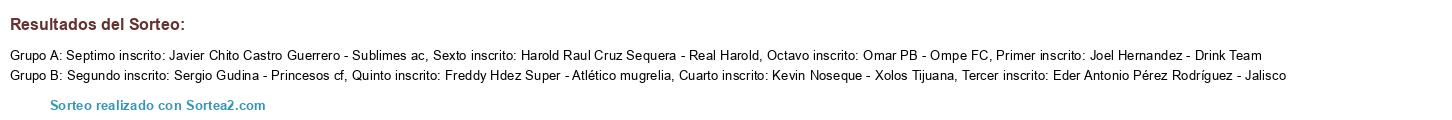 Lista de participantes: Primer inscrito: Joel Hernandez - Drink Team, Segundo inscrito: Sergio Gudina - Princesos cf, Tercer inscrito: Eder Antonio Pérez Rodríguez - Jalisco, Cuarto inscrito: Kevin Noseque - Xolos Tijuana, Quinto inscrito: Freddy Hdez Super - Atlético mugrelia, Sexto inscrito: Harold Raul Cruz Sequera - Real Harold, Septimo inscrito: Javier Chito Castro Guerrero - Sublimes ac, Octavo inscrito: Omar PB - Ompe FC.