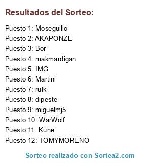 Lista de participantes: Bor, Martini, IMG, miguelmj5, TOMYMORENO, Kune, WarWolf, rulk, makmardigan, dipeste, AKAPONZE, Moseguillo.