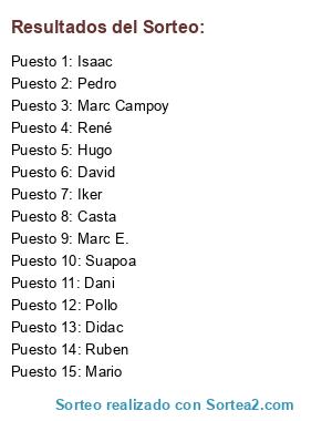 Lista de participantes: Marc E., David, Dani, Ruben, Didac, Iker, Pollo, Casta, Hugo, Isaac, Marc Campoy, Pedro, Suapoa, René, Mario.