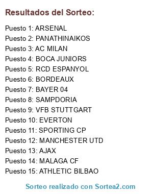 Lista de participantes: AC MILAN, AJAX, ARSENAL, ATHLETIC BILBAO, BAYER 04, BOCA JUNIORS, BORDEAUX, EVERTON, MALAGA CF, MANCHESTER UTD, PANATHINAIKOS, RCD ESPANYOL, SAMPDORIA, SPORTING CP, VFB STUTTGART.