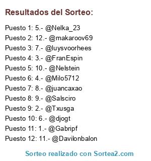 Lista de participantes: 1.- @Gabripf, 2.- @Txusga, 3.- @FranEspin, 4.- @Milo5712, 5.- @Nelka_23, 6.- @djogt, 7.- @luysvoorhees, 8.- @juancaxao, 9.- @Salsciro, 10.- @Nelstein, 11.- @Davilonbalon, 12.- @makaroov69.