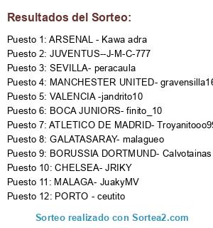 Lista de participantes: GALATASARAY- malagueo, PORTO - ceutito, VALENCIA -jandrito10, ARSENAL - Kawa adra, BOCA JUNIORS- finito_10, SEVILLA- peracaula, BORUSSIA DORTMUND- Calvotainas, JUVENTUS--J-M-C-777, CHELSEA- JRIKY, MANCHESTER UNITED- gravensilla16, MALAGA- JuakyMV, ATLETICO DE MADRID- Troyanitooo999.