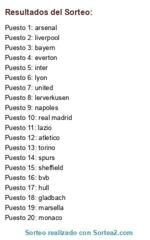 Lista de participantes: lerverkusen, everton, inter, hull, marsella, lyon, atletico, torino, bvb, united, monaco, lazio, real madrid, sheffield, napoles, arsenal, gladbach, bayern, spurs, liverpool.