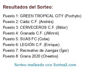 Lista de participantes: GREEN TROPICAL CITY (Pochyto), CERVECEROS C.F. (Bittor), SUAS FC (Cobe), Recreativo de Juergas (Ígor), LEGIÓN C.F. (Enrique), Granada C.F. (JMinrol), Grana 2020 (Cheetos), Cádiz C.F. (Andrés).