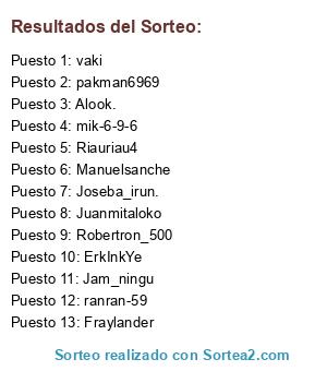 Lista de participantes: Alook., Joseba_irun, ranran-59, mik-6-9-6, ErkInkYe, Juanmitaloko, Manuelsanche, Jam_ningu, Fraylander, Riauriau4, Robertron_500, pakman6969.