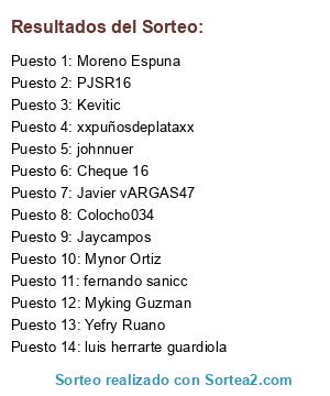 Lista de participantes: Moreno Espuna , Colocho034, Javier vARGAS47, PJSR16, Mynor Ortiz, Cheque 16, Jaycampos, fernando sanicc, Yefry Ruano, Myking Guzman, johnnuer, Kevitic, xxpuñosdeplataxx, luis herrarte guardiola.