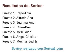 Lista de participantes: Angel-Cristina, Alfredo-Ana, Chan-Bea, Meri-Cubo, Mechas-Judith, Pepe-Lola, Juanma-Ana.