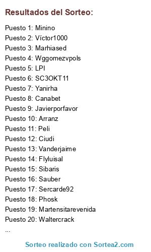 Lista de participantes: Arranz, Asacan, Canabet, Dakar, DeliriumTremens, Elvis Vive, Fernanpopi, Fly, Gomez99, HerlyPC, Jaimeguada, Jmprefasi, Jorgemtnez, Luis-donosti, Marhiased, Obafemi, sauber, Sibaris, Vanderjaime, Victor1000, Wgomezvpalf, Yugo Uds.