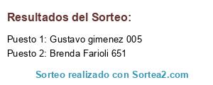 Lista de participantes: Daniel Garcia 480, Exequiel Pastrana 655, Marcos Pastrana 100, Brenda Farioli 651, Karen Lopez 173, Rodolfo Antonelli 931, Monica Cabezas 976, Simón Brizuela 990, Maxi Monroy 048, Gustavo gimenez 005, Lilia Herrera 249, Agustin reynoso 846, Raul alegre 104, Jose Ignacio Cari 364, Nicolas orellana 004.