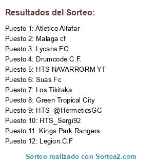 Lista de participantes: HTS_Sergi92, Lycans FC, Drumcode C.F., Green Tropical City, Malaga cf, Atletico Alfafar, Suas Fc, HTS_@HermeticsGC, HTS NAVARRORM YT, Kings Park Rangers, Legion.C.F, Los Tikitaka.