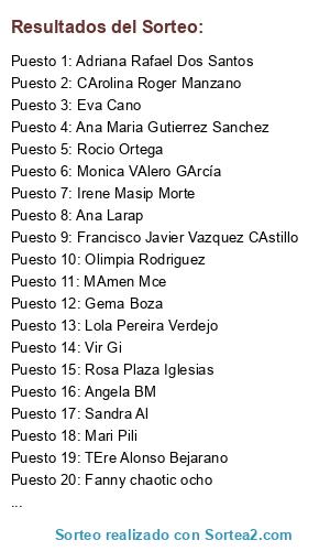 Lista de participantes: Ana Díez, Mari Angeles gonzalez ayuso, Mari Angeles gonzalez ayuso, Mari Angeles gonzalez ayuso, Mari Angeles gonzalez ayuso, Mari Angeles gonzalez ayuso, TRini Ramos, Ana Guerrero, Ana Guerrero, Sonia Allende, Noelia Alonso, Noelia Alonso, Noelia Alonso, Inma Fernandez, Juana Maria Gallego, Juana Maria Gallego, Juana Maria Gallego, Juana Maria Gallego, Juana Maria Gallego, Juana Maria Gallego, Juana Maria Gallego, Olimpia Rodriguez, Olimpia Rodriguez, Olimpia Rodriguez, Olimpia Rodriguez, Olimpia Rodriguez, Lola BErnal, Lola BErnal, Lola BErnal, Lola BErnal, Lola BErnal, Alicia Segura Montero, Alicia Segura Montero, Alicia Segura Montero, Maika Leibe, Maika Leibe, Maika Leibe, Maika Leibe, Mari Munin, Antonia Alvarez, Angela BM, Olvido MArtinez, Angel Moral Lopez, Ana MAria CH, Adelina Moreno, Ingridyjose peregrina, Mª Josefa Criado Azor, Mª Josefa Criado Azor, Mª Josefa Criado Azor, Mª Josefa Criado Azor, Mª Josefa Criado Azor, SAray Blazquez CAmpos, MAmen Mce, SAul Garcia, Vanessa Garcia, Macarena Soria, Macarena Soria, Macarena Soria, Macarena Soria, Macarena Soria, Macarena Soria, Macarena Soria, Macarena Soria, Macarena Soria, Macarena Soria, Juan Carlos Conde GArcia, Raquel Cantó Patiño, Raquel Cantó Patiño, Raquel Cantó Patiño, Gema Boza, Paulina MAria, Mari Angeles Llaosa Leon, Adoracion Perez, VEronica Ripoll, TEre Alonso Bejarano, TEre Alonso Bejarano, TEre Alonso Bejarano, TEre Alonso Bejarano, TEre Alonso Bejarano, TEre Alonso Bejarano, Cintia Sanchez, Mari Carmen Carpintero, Maria del Carmen Lledo, Maria del Carmen Lledo, Maria del Carmen Lledo, Maria del Carmen Lledo, Maria del Carmen Lledo, TRypanosoma Cati, TRypanosoma Cati, Ricardo GF, Francisco Garcia Jimenez, Adriana Rafael Dos Santos, Adriana Rafael Dos Santos, Adriana Rafael Dos Santos, Adriana Rafael Dos Santos, Adriana Rafael Dos Santos, Adriana Rafael Dos Santos, Adriana Rafael Dos Santos, Adriana Rafael Dos Santos, Adriana Rafael Dos Santos, Adriana Rafael Dos Santos, Adriana Rafael Dos Santos, Adriana Rafael Dos Santos, Adriana Rafael Dos Santos, Adriana Rafael Dos Santos, Adriana Rafael Dos Santos, Merce Gonzalez, Merce Gonzalez, Merce Gonzalez, Consuelo Cremades Martinez, Cris Galarza, Cris Galarza, Cris Galarza, Begoña Moro, Carmen Mon Ort, Mari Pili, Cristina Solanas, Lola Saborido, La magia de campanilla, Aquilino Vazquez, DAvid GArcia Rodriguez, Francisco Javier Vazquez CAstillo, Francisco Javier Vazquez CAstillo, Francisco Javier Vazquez CAstillo, Francisco Javier Vazquez CAstillo, Francisco Javier Vazquez CAstillo, Francisco Javier Vazquez CAstillo, Francisco Javier Vazquez CAstillo, Francisco Javier Vazquez CAstillo, Francisco Javier Vazquez CAstillo, Francisco Javier Vazquez CAstillo, Francisco Javier Vazquez CAstillo, Francisco Javier Vazquez CAstillo, Francisco Javier Vazquez CAstillo, Francisco Javier Vazquez CAstillo, Francisco Javier Vazquez CAstillo, CArolina Roger Manzano, Patry Newport Vega, Patry Newport Vega, Patry Newport Vega, Patry Newport Vega, Patry Newport Vega, Patry Newport Vega, Patry Newport Vega, Adela Gonzalez Flotats, VAnesa GArcia, Monica Vazquez, Jose Luis Capilla Carrion, Margarita Gago Rodriguez, Margarita Gago Rodriguez, Pedro MAnuel Bello, Pedro MAnuel Bello, Pedro MAnuel Bello, Pedro MAnuel Bello, Pedro MAnuel Bello, Mapi Garcia, Marta Díaz, Maria Dolores Romero Romero, Majoadri leiva, Majoadri leiva, Majoadri leiva, Marivi Manchado Almendariz, PAtricia Vicent, PAtricia Vicent, PAtricia Vicent, PAtricia Vicent, PAtricia Vicent, Monica VAlero GArcía, Monica VAlero GArcía, Monica VAlero GArcía, Monica VAlero GArcía, Monica VAlero GArcía, Monica VAlero GArcía, Monica VAlero GArcía, Monica VAlero GArcía, Tamara Bermudez, Carolina Ruiz Olivares, Julia Eugenia Lecha, Leticia Monedero Navarro, Yolanda Alvarez Saavedra, Yolanda Alvarez Saavedra, Yolanda Alvarez Saavedra, MArga VAlin, Lola Pereira Verdejo, Lola Pereira Verdejo, Lola Pereira Verdejo, Lola Pereira Verdejo, Lola Pereira Verdejo, Lola Pereira Verdejo, Lola Pereira Verdejo, Lola Pereira Verdejo, Lola Pereira Verdejo, Lola Pereira Verdejo, Lola Pereira Verdejo, Jose Miguel Fernandez Ariza, Loly Villa Peña, Loly Villa Peña, CArmen RB, CArmen RB, CArmen RB, Rocio Ortega, Rocio Ortega, Rocio Ortega, Rocio Ortega, Rocio Ortega, Rocio Ortega, Rocio Ortega, Rocio Ortega, Rocio Ortega, Rocio Ortega, Rocio Ortega, Rocio Ortega, Rocio Ortega, Rocio Ortega, Rocio Ortega, Rocio Ortega, Rocio Ortega, Rocio Ortega, Rocio Ortega, Rocio Ortega, Mari Mamen, Raquel Ortiz Rubio, Raquel Ortiz Rubio, Raquel Ortiz Rubio, Raquel Ortiz Rubio, Raquel Ortiz Rubio, Sara Gonzalez Suarez, LEticia Cayon Arranz, LEticia Cayon Arranz, LEticia Cayon Arranz, LEticia Cayon Arranz, LEticia Cayon Arranz, LEticia Cayon Arranz, LEticia Cayon Arranz, LEticia Cayon Arranz, LEticia Cayon Arranz, LEticia Cayon Arranz, LEticia Cayon Arranz, LEticia Cayon Arranz, LEticia Cayon Arranz, Ines Moira, Ines Moira, Ines Moira, Ines Moira, Ines Moira, Sagrario Rodriguez, Pepi Carol Fenandez, Pepi Carol Fenandez, Pepi Carol Fenandez, Pepi Carol Fenandez, Charito Lopez Garcia, Maria Guirao, Maria Guirao, Maria Guirao, MAnolo Edo, Isa Chiclana, Almudena Miravete, Almudena Miravete, Almudena Miravete, Almudena Miravete, Edo Alberto, Yolanda de Dios, Jordi Lopez, Jordi Lopez, Jordi Lopez, Jordi Lopez, Rafael Celi, Cruz Maria Ruiz Madrid, MAria Albores, Elena Gonzalez, Javier Beltan Carceller, Maria Jose sanchez valera, Yolanda Marti Miralles, Yolanda Marti Miralles, Yolanda Marti Miralles, Antonio Pozo Lopez, Ana Villayambre robles, Pilar Pairet Valls, Pilar Pairet Valls, Pilar Pairet Valls, Pilar Pairet Valls, Pilar Pairet Valls, Dolores Alvarez, Mari RAmirez, Anita Conce, Anna Perez, Raquel Moyano Coca, Ana Fernandez Seco, Ana Fernandez Seco, Ana Fernandez Seco, Paula Rodrigo, M Carmen Serrano, M Carmen Serrano, M Carmen Serrano, Rosa MArtin, Mercedes Lopez Cecilia, Mª Jesus Gonzalez Fernandez, Ana Larap, Ana Larap, Ana Larap