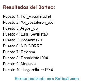 Lista de participantes: Boneym120, Argon_85, Fer_vivaelmadrid, Legendkiller1234, Megaiva, Rexloba, Ronaldista1000, Xx_costaleroh_xX, Luis_Sevillista9, NO CORRE.
