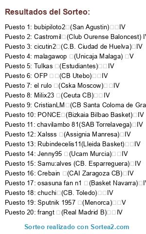 Lista de participantes: DKR_07 (Panathinaikos) V, j-220894 (Lagun Aro GBC) V, malagawop (Unicaja Malaga) V, osasuna fan n1 (Basket Navarra) IV, Maikel21 (Lucentum Alicante) IV, Crebain (CAI Zaragoza CB) IV, Jenny95 (Ucam Murcia) IV, Xalsss (Assignia Manresa) IV, diegofm_boal (Maccabi Tel Aviv) IV, Sputnik 1957 (Menorca) V, jcnavarro88 (Gran Canaria) V, el rulo (Cska Moscow) IV, Tulkas (Estudiantes) IV, Magocanario (Caja Laboral Baskonia)IV, Malu (Montepaschi Siena) VI, frangt (Real Madrid B) IV, Sound (Caceres 2016) IV, Samu:alves (CB. Esparreguera) IV, Milix23 (Ceuta CB) IV, chuchi (CB. Toledo) IV, Miguelhierro (Gran Canaria 2014) VI, Jcunill (SAS Suria) IV, Agache (UB la Palma) IV, mi2 (CAB Obradoiro) IV, PONCE (Bizkaia Bilbao Basket) IV, Choco__ (Oklahoma City Thunder) IV, Serjah (Fuenlabrada SAD) VI, OFP (CB Utebo) IV, Rubindecelis11(Lleida Basket) IV, cicutin2 (C.B. Ciudad de Huelva) IV, bubipiloto2 (San Agustin) IV, CristianLM (CB Santa Coloma de Gra) IV, Castromil (Club Ourense Baloncest) IV, chavilambo 81(SAB Torrelavega) IV.