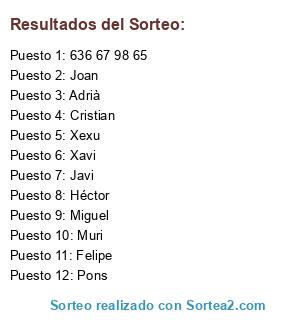 Lista de participantes: Adrià, Cristian, Héctor, Javi, Joan, Muri, Pons, Xavi, Felipe, Miguel, Xexu, 636 67 98 65.