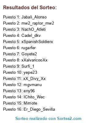 Lista de participantes: Cadel_dkv, eny96, rugarfer, yepe23, NachO_Atleti, mw2_raptor_mw2, xXalvaricooXx, Jabali_Alonso, xSpanishSoldierx, Er_Diego_Sevilla, IChito_Wec, mgvmanu, Surfi_1, Goyete2, xX_Divy_Xx, Mimote.
