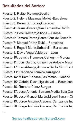 Lista de participantes: Marta Cano,Tarrega–Lerida(5 participaciones), Oscar Martinez,Terrassa – Barcelona(2 participaciones), Javier Reyes,Santa Cruz de Tenerife(3 participaciones), Angels Domingo,Sant Celoni – Barcelona(3 participaciones), Guillermo Camaron,Fuente el Saz de Jarama – Madrid(2 participaciones), Cristina Cerro,Campos – Baleares(15 participaciones), Oscar Esteve,Barcelona(2 participaciones), Alejandro Diaz,Madrid(3 participaciones), patricia Humerez,Cehegin – Murcia(11 participaciones), Guillermo Primo,Valladolid, Angel Barrejon,Rivas Vaciamadrid – Madrid(4 participaciones), Torcuato Vallejo,Terrasa – Barcelona(3 participaciones), Angel Gomez,Salamanca(3 participaciones), Josep Paricio,Barcelona(3 participaciones), Soraya Bernal,Sanjuanjeo – Salamanca(2 participaciones), Juanjo Castosa,Santa Coloma de Gramenet – Barcelona(17 participaciones), Pablo,Barcelona(19 participaciones), Francisco Tornero,Tarragona(20 participaciones), Eugeni Marin,Sabadell – Barcelona(30 participaciones), Bernardo Torres,Cordoba(2 participaciones), Francisca Pérez, Ripollet - Barcelona(15 participaciones), Pedro Molina,Palma de Mallorca(2 participaciones), Francisco Gonzalez,Santa Cruz deTenerife(3 participaciones), Juan Antonio Garcia,Leon(3 participaciones), Francisco Javier Casco,Aceuchal – Badajoz(13 participaciones), Gabriel Diaz,Lliça de vall – Barcelona(17 participaciones), Roberto Perez,Burgos(3 participaciones), Carolina Rodriguez,Madrid(4 participaciones), Gabriel Del Cura,Oviedo(5 participaciones), Juan De Vega,Almendralejo – Badajoz(39 participaciones), Julio Ferreiro,Lugo, Manuel Guillen,Ermita de Patiño – Murcia(3 participaciones), Unai Vivar,Barcelona(4 participaciones), Jose Manuel Giraldez,Premia de dalt – Barcelona(3 participaciones), Maria Rodriguez,Madrid(3 participaciones), Beatriz Gozalbo,Madrid(2 participaciones), Salome Alonso,Oviedo(2 participaciones), Erika Proaño,Parla – Madrid(3 participaciones), Maria Isabel Prieto,Castellar -Jaen(3 participaciones), Carmen Garcia,Leon(2 participaciones), Angel Genis,Xátiva – Valencia(3 participaciones), Ana Isabel Rodriguez,Barakaldo – Vizkaya(4 participaciones), Hugo Torreiro,Cambre – A coruña(4 participaciones), Maria Angeles Basurto,Peralta – Navarra(3 participaciones), Nati Segura,Les roquetes – Barcelona(4 participaciones), Jesus Herrero,Salamanca(9 participaciones), Emilio Alvarez,Madrid(8 participaciones), Vicente Gonzalez,El Toyo – Almería(8 participaciones), Juan Jose Perez,Castro Urdiales – Cantabria(2 participaciones), Justo Jimenez,Tomelloso – Ciudad Real(2 participaciones), Jorge Luis Ledesma,Valladolid – Valladolid(3 participaciones), Marisol Marañon,Monachil – Granada(6 participaciones), Helena Masanas,Mollet -Barcelona(17 participaciones), Jose Enrique Fernandez,San Sebastian – Guipuzcoa(2 participaciones), Benet,Barcelona(12 participaciones), Maria Juan Anglada,Ciutadella – Baleares(4 participaciones), Jose Ramon Padilla,Ciudad Real(7 participaciones), Patricia Contreras,San Vicente del Raspeig – Alicante(3 participaciones), Jordi Jove,Barcelona(8 participaciones), Hernan Jaramillo,Andratx Baleares(3 participaciones), Ruben Gomez,Cuellar – Segovia(7 participaciones), Cristian Espinar,Santa Margarita de Montbui – Barcelona(2 participaciones), Jose Manuel Martin,Miguel Turra – Ciudad Real(2 participaciones), Emilia Saucedo,Ibiza – Baleares(6 participaciones), Jesus Alvarez,San Fernando- Cadiz(20 participaciones), Mingo Marti,Ferreries Menorca- Islas Baleares(6 participaciones), Montserrat Cros,Fornells de La Selva- Girona(5 participaciones), Maricarmen Tejeda,La bisbal del penedes- Tarragona(3 participaciones), Aritz Sumillera,Beasain – Guipuzcoa(2 participaciones), Miriam Berlana,Las Matas – Madrid(8 participaciones), Tamara Perez,Santa Cruz de Tenerife(2 participaciones), Jorge Dieste,Jaca – Huesca(20 participaciones), Fernando Navarro,Petrer – Alicante(2 participaciones), David Vega,Valderas – Leon(8 participaciones), Pere Romero,Albons – Girona(4 participaciones), Laura Ibern,Barcelona(3 participaciones), Yeray Exposito,Las Palmas de Gran Canarias(2 participaciones), Isabel Molina,Salou – Tarragona(18 participaciones), Bakari Gibba,Mataró – Barcelona(2 participaciones), Jasone Treviño,Lekeitio - Vizcaya(4 participaciones), Miriam Jimenez,Torre del campo – Jaen(4 participaciones), Fernando Sastre,Madrid(4 participaciones), Hector Sixto,Barcelona(20 participaciones), Miguel Dominguez,Valencia(4 participaciones), Jorge Antonio Aracena,Carrizal de Ingenio – Palmas de Gran Canarias(27 participaciones), Celia Aguilera,Peligros,Poligono de Asegra – Granada(4 participaciones), Monica Llinares,Alcoy – Alicante(4 participaciones), Estefania Ciobanu,Coslada – Madrid(3 participaciones), Luis Garcia,Torrejon de Ardoz – Madrid(18 participaciones), Yolanda Mazkiaran,Alsasua – Navarra(6 participaciones), Jesus Fernandez,Madrid(4 participaciones), Indira Ramirez,Madrid(13 participaciones), Maria Parra,Pontejos – Cantabria(18 participaciones), Manuel Diez,Alella – Barcelona(3 participaciones), Daniel Torres,Palma de Mallorca(8 participaciones), Carlos Gallego,Navalcarnero – Madrid(4 participaciones), Juan Antonio Perez,Luarca – Asturias(5 participaciones), Saul Blanco,Madrid – Madrid(2 participaciones), Maria del Carmen Sanchez,A Coruña(4 participaciones), Pablo Prado,Moraleja de Enmedio – Madrid(9 participaciones), Maria Ceballos,Pamplona – Navarra, Alba Dorado,Madrid(8 participaciones), Monica Garcia,Bilbao – Vizcaya(4 participaciones), Maria del Carmen Noya,Pamplona – Navarra(6 participaciones), Angel Ventura,Pobla de Montornes – Tarragona(20 participaciones), Manuel Teruel,Ibi – Alicante(7 participaciones), Mitica,(2 participaciones), Borja Viz,Olesa de Montserrat – Barcelona(5 participaciones), Isabel Ruano,Barcelona(3 participaciones), Leo Arteaga,Arona – Santa Cruz de Tenerife(4 participaciones)