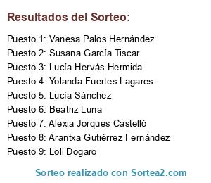 Lista de participantes: Adriana Fernández de Castro, Ainara Alzola, Albertina Castán, Alejandra Mosquera, Alexia Jorques Castelló, Alicia Ponce, Amparo Mendoza, Ana Hernando, Ana María García Zaragoza, Ana Pasalodos, Anabella Solano, Arantxa Gutiérrez Fernández, Bárbara María Ruiz Sánchez, Beatriz López Dañobeitia, Beatriz Luna, Beatriz Páramo, Beatriz Ruíz Alonso, Bei Muñio, Carmen Humanes Ruíz, Carolina Ballester Hermán, Carolina Castillo, Carolina Martinez Juarez, Carolina Sánchez, Celeste González, Charo Botín, Clara Jarabo Aguado, Cris Camps, Cristina Brun Camins, Cristina Peinado, Cristina Rodriguez, Cristina Valenzuela, Daniela Acevedo, Desiree Baños, Elaine Betancor Montilla, Elena Castro Ruíz, Elena García Z., Elena Laguna Abajo, Eli Cáceres, Elisabeth Gloria, Emma Posada, Esmeralda Conde, Esther Gómez del Camp, Esti Portillo Berasaluze, Eva Mª Zarco, Eva Martínez Moreno, Gaspar Garrido, Helen Sanchez, Inma Navarro Murcia, Irene de Miguel, Irene García Vidal Es., Irene Martínez Nebot, Ivana Coria, Janet Rodriguez, Jessica Gómez Alvarez, Jessica Rodríguez, Jezabel Ruiz, Judith Aragonés, Lara Guerra Ugarte, Lara Pérez Dueñas, Laura López García, Laura Prieto, Laura Vicens Rafet, Loli Dogaro, Lorena García, Lucía Hervás Hermida, Lucía Sánchez, Lucy Lo Cascio, Luis Miguel Rastrojo, Mª Jesus Micó Ballester, Mari Carmen Almiñana, María Rodríguez Fuentes, María Asensio, María del Carmen Delgado Moreno, María José González, María José Rodríguez, María José Tena Flórez, Maribel López Nieves, Marina Sancho Roca, Marta Segado Duelo, Marta Vázquez Otero, Matilde Pauner, Miriam Simón, Mónica Torán, Montse Conejo, Montse Llorens, Montse Sánchez Barcia, Natalia López Salgado, Nerea Veganzones, Noemi Zalaya, Nuria Molina Medina, Oiana Ortega, Olga Fernández, Patricia Alepuz, Patricia González Aguilar, patricia jabonero, Patricia Ruíz, Pilar Heredia Uceda, Pilar Ruíz del Mazo, Raquel Casanova, Raquel Díaz Córdoba, Raquel Fatela, Raquel Henche, Raquel Pinazo, Rebeca González Bayón, Rebeca Luis Púa, Rocío Dorado, Rosa Elena Espinosa, Ruth Cañadas, Ruth Peralta, Ruth Rodríguez, Sandra Gadea, Sandra Peñalosa, Sandra Sánchez, Sara Cantos, Sergi Navarro, Silvia Betancor Montilla, Silvia Guerrero, Sònia Riba, Susana Cenalmor González, Susana Ferreiro Mediante, Susana García Tiscar, Tatiana Martin, Vanesa Palos Hernández, Verónica Alonso, Verónica Santos, Yolanda Fuertes Lagares, Susana Arriols.