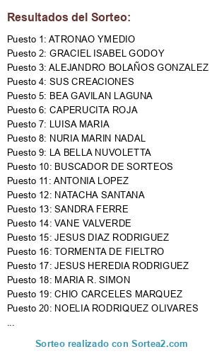 Lista de participantes: ANA BELEN FERNANDEZ GONZALEZ (3 participaciones), ANDREA FERNANDEZ (3 participaciones), ANTONIA MARTINEZ GRANERO, MARIO LOPEZ MARTINEZ (3 participaciones), DAVID FERNANDEZ MARTINEZ, MONTSE GARCIA BARREIRA, CARMEN AORNOS PARA EL PELO, VERONICA MORLERO ALONSO (3 participaciones), NORTE COMPLEJO DISCOTECA, VANESA DA ROSA PASCUAL (3 participaciones), MAR FUENTES, ASP CREACIONES, BAUL DE MALINKA, MB DISSENY EN BIJUTERIA, DETALLES DE LUJO, MAICA SONEIRA CASTIÑEIRA, SILVIA PEREZ SOLANA, DELIA VILLAR RODRIGUEZ (3 participaciones), LUISA FLUIXA (3 participaciones), LA ANJANA MANUALIDADES (3 participaciones), DINA TORRES, EL RINCONCITO DE MARIA, MARCOPS BRISA MARINA, NATACHA SANTANA, RAQUEL RUEDA, AIDA PINTO, INMA DELGADO PORTILLO, PAKU PEREZ MARTINEZ, TORMENTA DE FIELTRO (3 participaciones), LORENA CASALES CRESPO, PILAR ALVAREZ (3 participaciones), CINTAS FANTASTICAS, EL BAUL PURPURA, MIRIPOSITA RUIZ ANTOLIN (3 participaciones), ANA MARIA MOTA BOGA, SILVINA DOMINGUEZ, VERONICUCA TOLOLA, ELENA ALVAREZ BUSTELO (3 participaciones), MARY KATE MANUALIDADES, CRISTI MORENO, LUISJA DEE JAY, MATERIALES PARA QUE CREES, BEATRIZ RUIZ PEREZ, JESUS DIAZ RODRIGUEZ, MARIA ISABEL NOVOA DIAZ, BELEN FERNANDEZ, CARMEN MUÑOZ CARLAXY, ARTEMM DISEÑO GRAFICO, GATITA LOCA, MARIO TRAVIESO PUENTE, NURIA TALAVERA, EWA WALENDZIK, BEGO MARTINEZ PEREZ, BEATRIZ BAÑEZA RIVAS (3 participaciones), NURIA AÑON RODRIGUEZ, MARI LOPEZ ESTEBAN, MARINA ALONSO PASTOR, MERCHI LEAL, MONTSE GONZALEZ COLOME, LA NUIT, M. LUISA SANZ VICO, MARIVI SALCEDO, YAZMI LUIS, MARIAN ER, JUSI GRASS, LORENA GARCIA (3 participaciones), LOLA FERNANDEZ, LORENA SEGURA, MARY ALBILIO SILVA, RAQUEL PRADO, LA BELLA NUVOLETTA, ESTEFANIA EL HADA, SARA VILLAR PEREZ (3 participaciones), LAURA GUZMAN LOPEZ, GRACIEL ISABEL GODOY, TERE DE LA INSUA (3 participaciones), VGS REGALOS VERONICA(3 participaciones), BEATRIZ ARROYO, ALEJANDRO BOLAÑOS GONZALEZ (3 participaciones), CRISTINA DEL FLUSS, BEGOÑA FERNANDEZ ABOLI, CAMO PESTANA, MARIA JOSE ESPAÑA LOPEZ (3 participaciones), SONIA DEL ESTAL FERNANDEZ (3 participaciones), ROSANA LLORENTE MARTINEZ, AINOIDEA MANUALIDADES (3 participaciones), LUISA MARIA (3 participaciones), CHIO CARCELES MARQUEZ (3 participaciones), MILI GATA BIONIKA (3 participaciones), VANESSA SERRANO MARIN, GAMIR PEREZ, MARIA VICTORIA RUBIO LUQUE (3 participaciones), YENI VARELA DE RIVAS, DEMIMBRE MANUALIDADES, DE LA ROSA PILI, DAVID CARRETE MARTINEZ (3 participaciones), BEA FERNANDEZ MARTINEZ (3 participaciones), EVA ARIAS NAVARRO, ANA CENTENO GARCIA (3 participaciones), BEATRIZ GIL NIKKI COMPLEMENTOS, LORENA VAZQUEZ BRIZUELA (3 participaciones), AINTZANIKA LOPEZ (3 participaciones), RUTH SANJUAN (3 participaciones), GABRIELA GONZALEZ FERNANDEZ (3 participaciones), MARIA PILAR MOYA MARCOS (3 participaciones), MERCHY QUINTEIRO GARCIA (3 participaciones), NOLI QUINTEIRO (3 participaciones), CARMEN GARCIA MAGADAN (3 participaciones), DESIREE RAMIREZ SANTANO (3 participaciones), ROBLEDO RIO SANDRA (3 participaciones), NENNY GOMEZ (3 participaciones), LIZ MEDINA (3 participaciones), JESUS HEREDIA RODRIGUEZ (3 participaciones), ESTHER RODRIGUEZ RECHE (3 participaciones), MAMI DUNA CAROLINA (3 participaciones), MARTA SANCHO (3 participaciones), ANDREA VAZQUEZ (3 participaciones), GLORIA BES (3 participaciones), AINHOA PATRICIA JUAREZ (3 participaciones), PAULA NAVE (3 participaciones), CHELO MOA (3 participaciones), MARTA MONTERO TORO (3 participaciones), DOLORES AMADOR MORENO, PATRICIA ESPADA SESAR (3 participaciones), ANTONIA LOPEZ (3 participaciones), NICOLE STEPHANIE ESPINOZA (3 participaciones), ENCARNI SANCHEZ ALANIS (3 participaciones), FILTRO FELT FELTRO FLANEL (3 participaciones), MARIA RUANO GOMEZ, INMA CERVERA (3 participaciones), MARY MAR GUANCHE GONZALEZ (3 participaciones), LENA´S WAY, MARTA REYES RANDEZ, PATRICIA RIVEIRO GARCIA (3 participaciones), LALI FDEZ ESTEVEZ, SONIA GONZALEZ CAMACHO (3 participaciones), EMILIO SAMPEDRO, EVA TRUJILLO (3 participaciones), ALBA MARIA GONZALEZ MUÑOZ (3 participaciones), MIS COSITAS MIAS (3 participaciones), PATRICIA SIGUERO CRAQUIS (3 participaciones), CARMEN PERAL TOSCANO (3 participaciones), ANA CHICO (3 participaciones), SUSANNA MERCADE (3 participaciones), MELANIA BEVILACQUA, JIMMY PEREIRA, EMILY PEREZ CELA (3 participaciones), VIKY LLOPIS, VANESSA BARREIRA BLANCO, FOFUCHAS LINDAS (3 participaciones), KYMA NAVAS (3 participaciones), NURIA MARIN NADAL (3 participaciones), MONICA LESTON DOMINGUEZ (3 participaciones), MONTSE ALONSO (3 participaciones), MYRIAM ADSUAR PAEZ (3 participaciones), MONTSE FERNANDEZ MARTIN (3 participaciones), ESTHER FERNANEZ ROCHA, JAVI GALLEGO (3 participaciones), ELIMINANDO BARRERAS, PAULA GARCIA KRISTEN (3 participaciones), M. CARMEN SANTIAGO (3 participaciones), JONATHAN GONZALEZ VILLAR (3 participaciones), ALEJANDRA ORTIZ, UBALDO FERNANDEZ (3 participaciones), MARGA VILA PAZ, ANA CRISTINA SANCHEZ PEÑA (3 participaciones), SOPHIA SANCHEZ PEÑA, PILAR CARBAJO TURRADO, YOLANDA GONZALEZ GUTIERREZ, DAVID GONZALEZ FELIZ (3 participaciones), JUAN MANUEL SALVI, JONATHAN PENA PALACIOS, MARIA JOSE HADITA LADBRADOR SAEZ (3 participaciones), CHELO LOBO REYES, CLAUDIA GONZALEZ PEREZ, ANA BELEN CONZALEZ RODRIGUEZ, SABRINA RAMIREZ, SHAMIRA ALONSO LUCAS, DAVID TEIXEIRA, SULAMITA LOIDA SOSA BELLIDO (3 participaciones), MAR DE LA TORRE, ELSA DIAZ RODRIGUEZ, CRIXX CROTF CROTF, EL BAUL DE LAS TELAS, COSICAS DE FIMO, RAQUEL PLAZA LOPEZ, DIANA MIOÑO FERNANDEZ, CARMEN ESCUDERO ARMESTO, MARIA PELAYO, JUDITH FAUS PASCUAL, AMPARO VIVEZ SENENT (3 participaciones), MARIA MONTSERRAT MARTIN GUILU, GLORIA CASTELLANOS SANTOS (3 participaciones), HERMINIO GUEDES, SOFIA ESTHER RUIZ GARCIA, MANUALIDADES CON ARTE, AGUJAS PINCELES MAGICOS, LUCIA XAICA, ELENA ALVAREZ DE CASTRO, FIELTROS AMPARO, HECHO A MANO TAMARA (3 participaciones), EGLEE SAGGESE, ELIZBETH PULIDO, YOLANDA GLEZ CAMACHO (3 participaciones), JOSE CARLOS BRAÑAS FERNANDEZ (3 participaciones), SILVINA GANCER (3 partic