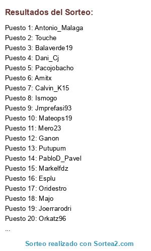 Lista de participantes: Adri_mad, Amigo Klapau, Balaverde19, Calvink_15, Chekoslovako, Disaster, Hill, Ismogo, Javierporfavor, Joserrarodri, Klapau, Markelfdz, Mormonpower, Pera Mayor, Phosk, Pingudaa, Putupum, Ricardo27, TXIN, Waltercrack, Winchester, Yanirha.