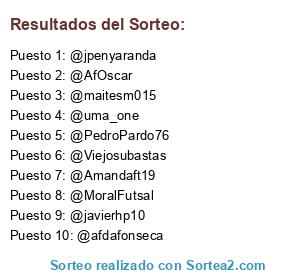Lista de participantes: @JuanATM87, @Richymambur99, @rovira_ruiz, @jaime_alcalde, @juanmi_85, @Viejosubastas, @jsierra82, @inakyfdez, @MoralFutsal, @Smileheretwo, @javierhp10, @AcevedoDaniel32, @rocamo18, @afdafonseca, @Cristian5CP, @RubenFp95, @gf_ivan13, @carlosmace26, @jpenyaranda, @DaniTachu, @ElSorteator, @Yorkquemealegro, @karpin2009, @AfOscar, @colosuperpower, @Amandaft19, @uma_one, @Ubeda10, @PedroPardo76, @crisrt_86, @maitesm015.