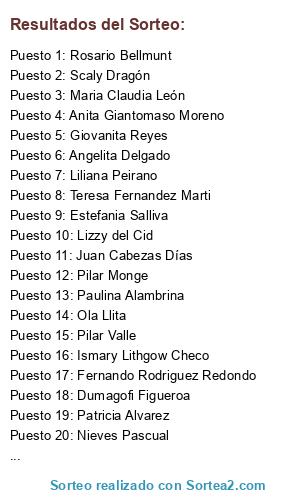Lista de participantes: Scaly Dragón, Naikari Foro, Montsrar Mischicos y yo, Maria Teresa Medina, Rosa Santiago , Ismary Lithgow Checo, Pilar Monge, Liliana Bronstein, Fernando Rodriguez Redondo, Lizzy del Cid, Teresa Fernandez Marti, Pilar Gaytan Pérez, Vanessa Fernández Delgado, Angelita Delgado, Cindy Umaña, Nieves Pascual, Estefania Salliva, Cindy Conoz, Yasmin Aracely, Patricia Maria Leite Strozzi, Rosario Bellmunt, Nancy Pimentel, Liliana Peirano, Pilar Valle, Juan Cabezas Días, Rosa Maria Mendoza, Paqui Gonzales Sarrión, Tiffany Aguilar, Dumagofi Figueroa, Ortegaps Julieta, Yani Jaime, Maria Claudia León, Giovanita Reyes, Sandra Servil, La Desmesurada, Anita Giantomaso Moreno, Patricia Alvarez, Paulina Alambrina, Ola Llita, Rossy Gutierrez Sánchez, .