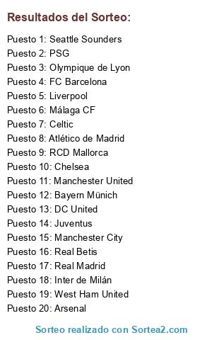 Lista de participantes: Real Madrid, West Ham United, Málaga CF, Chelsea, Celtic, DC United, Bayern Münich, Arsenal, Seattle Sounders, Manchester City, PSG, Olympique de Lyon, Inter de Milán, Atlético de Madrid, FC Barcelona, Juventus, RCD Mallorca, Real Betis, Liverpool, Manchester United.