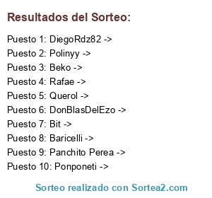 Lista de participantes: Ponponeti ->, Querol ->, Polinyy ->, Bit ->, Beko ->, Rafae ->, Panchito Perea ->, Baricelli ->, DonBlasDelEzo ->, DiegoRdz82 ->.