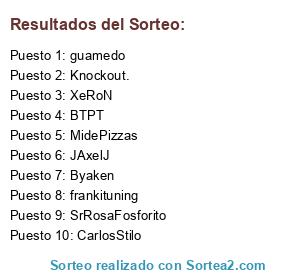 Lista de participantes: MidePizzas, JAxelJ, Yogurt de Piña, ParaleloEDM, frankituning, guamedo, SrRosaFosforito, Byaken, Knockout., BTPT, XeRoN, CarlosStilo.